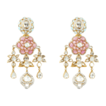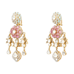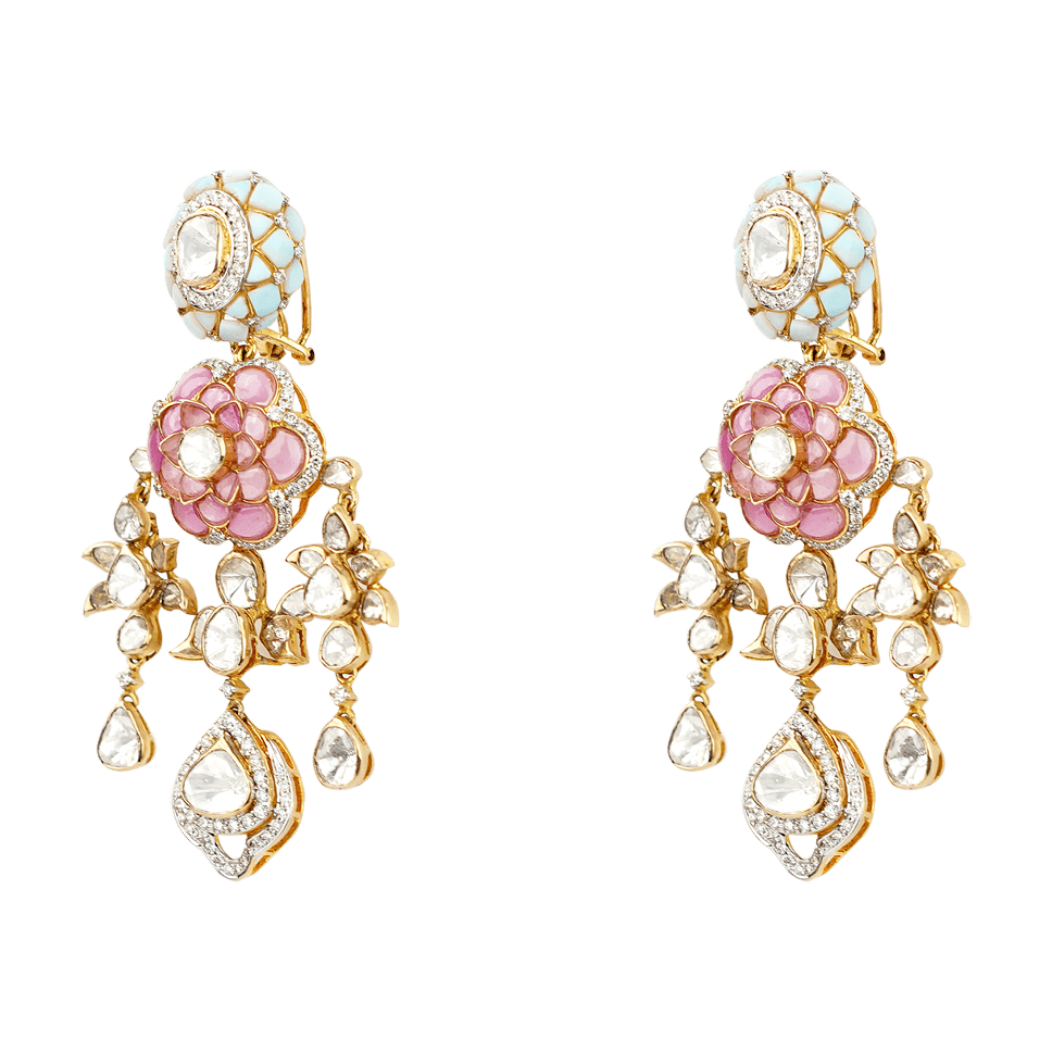 Pastel hues of blue and pink enamel highlighted on earring with embellishments of uncut diamonds in open setting.